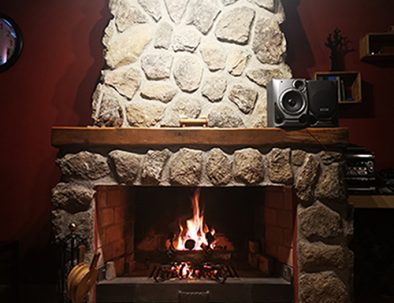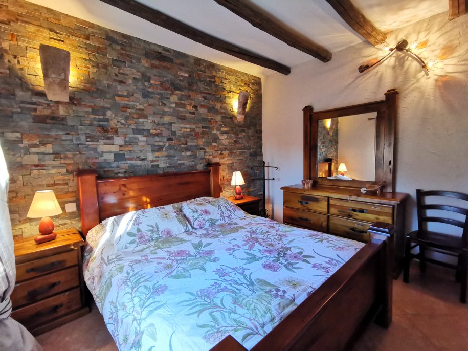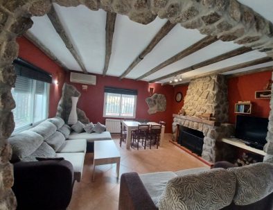 Amplia chimenea de piedra con repisa de madera, recogecenizas y todos los utensilios para su uso. Dispone además de salvachispas. Incluye leñera con troncos.
