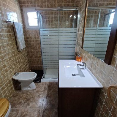 Cuarto de baño completo, con plato de ducha, lavabo, bidet, wc y secador de pelo